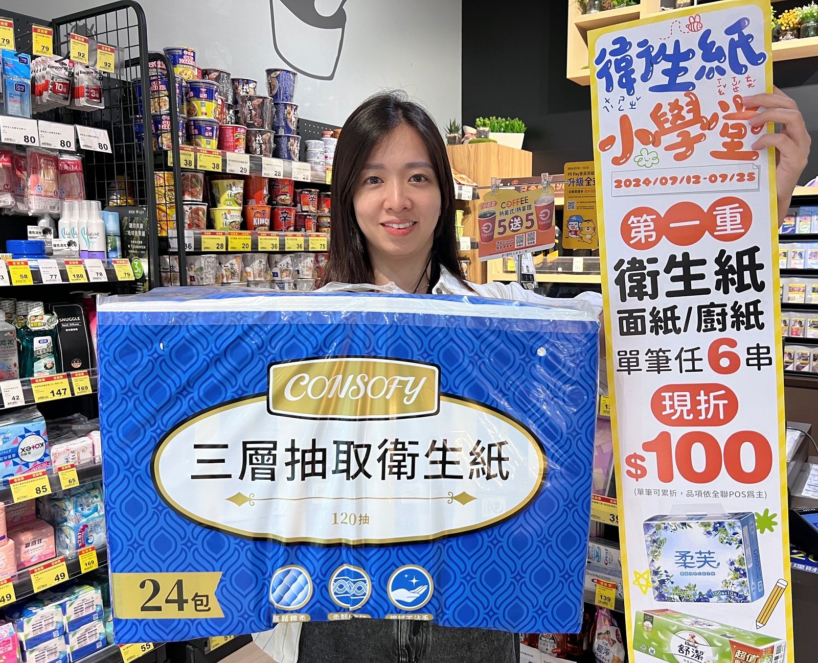 主打柔韌不易破,廣受消費者好評的「CONSOFY 3層抽取衛生紙24包」售價365元,7/25前一次買6串享現折100元外,再加贈1,000福利點,回饋後平均每包只要13.82元,真的天天都便宜!同場加映眾多買1送1品項,「Scott可麗舒3層柔厚抽取衛生紙10包」單串特價279元,買1送1,平均一串只要139.5元,一次買6串回饋後平均每包下殺10.62元,每抽只要0.1062元;全聯獨家「蒲公英綠茶3層環保抽取式衛生紙10包」單串特價238元,買1送1,平均一串只要119元,一次買6串回饋後平均每包不到8.57元,每抽只要0.086元省很大!還有新商品「得意3層抽取式衛生紙24包」每串298元,買6串回饋後平均每包下殺11.03元,平均每抽0.1103元。檔期優惠衛生紙、面紙、廚紙、濕式衛生紙便宜下殺,趁現在買越多省越多!