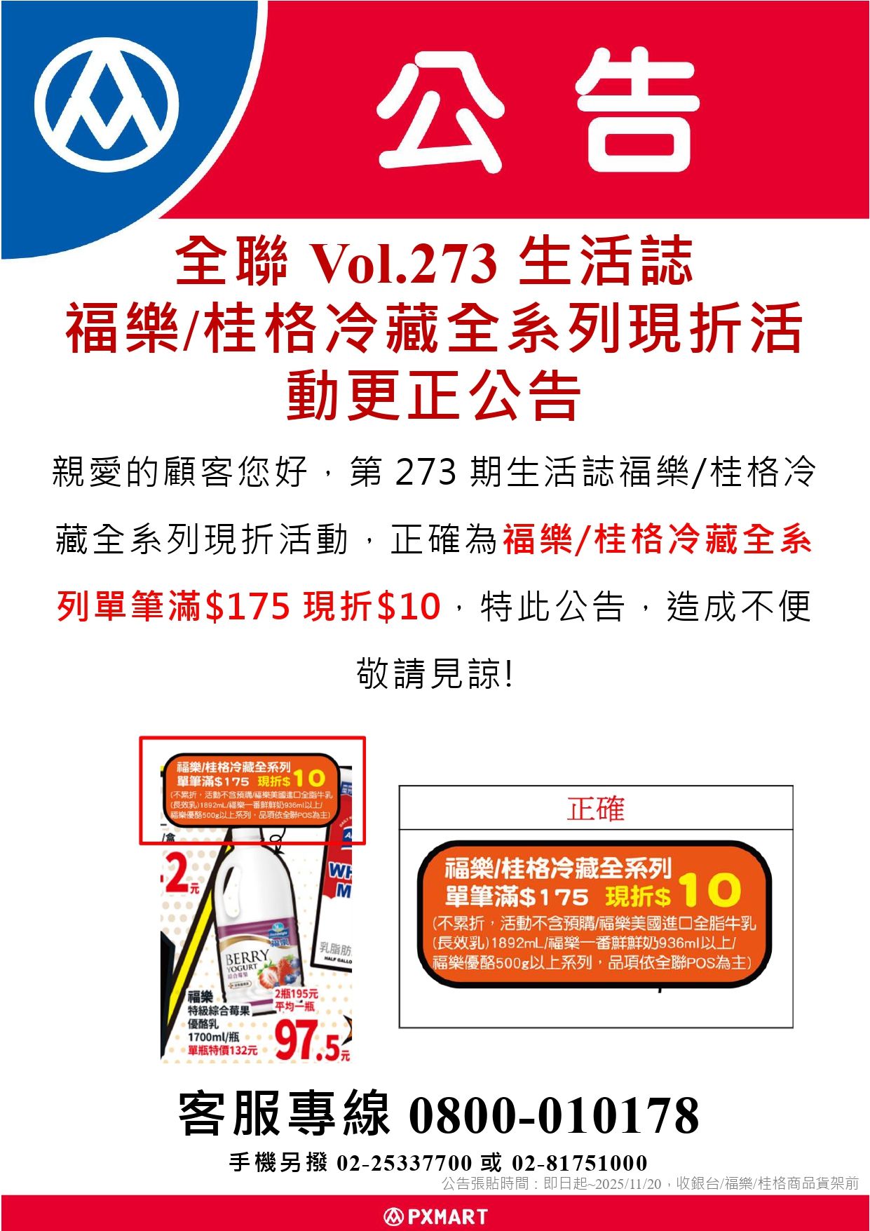 【公告】全聯273期生活誌-福樂/桂格冷藏全系列現折活動更正公告