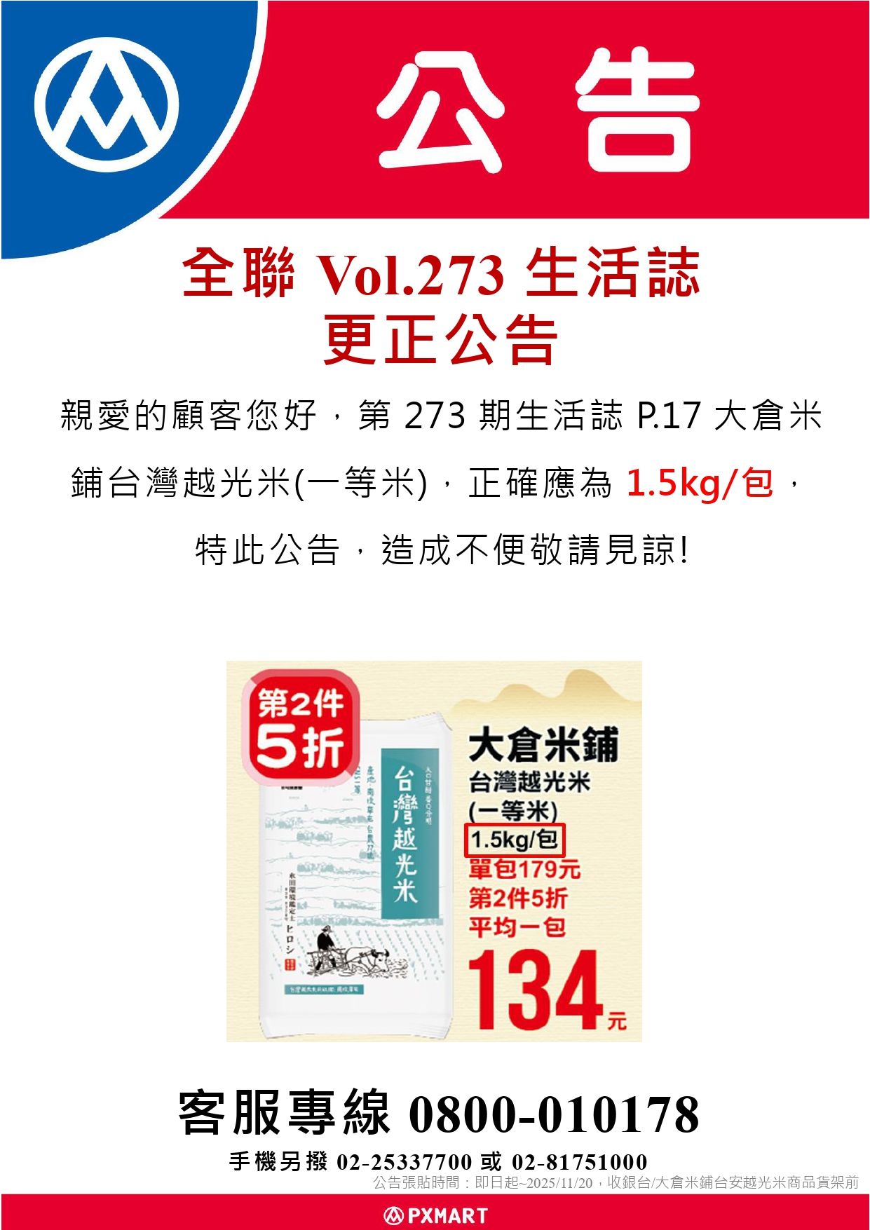【公告】全聯273期生活誌-大倉米鋪台灣越光米更正公告