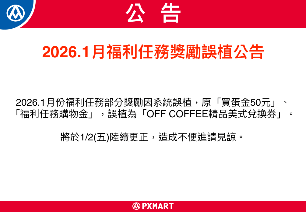 【公告】2026.1月福利任務獎勵誤植公告
