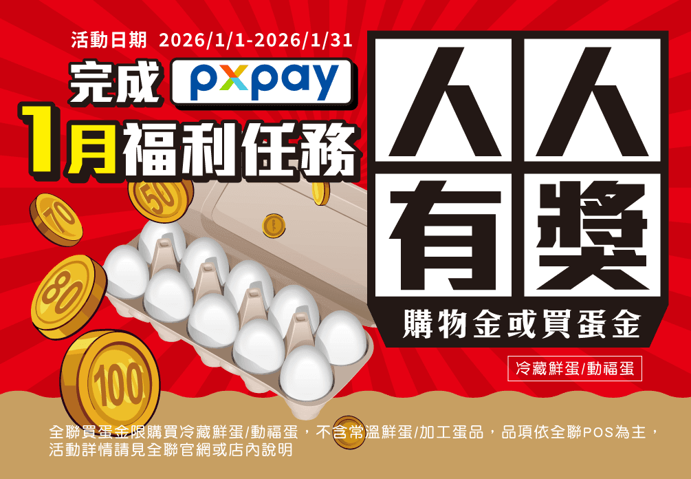 (3) 本活動獎項將於2026/1/9(五)前將獎項(電子禮卡)以PX Pay APP推播方式提供至得獎者電話號碼之PX Pay帳戶,請務必開啟PX Pay APP推播通知,並留意通知及訊息匣訊息。