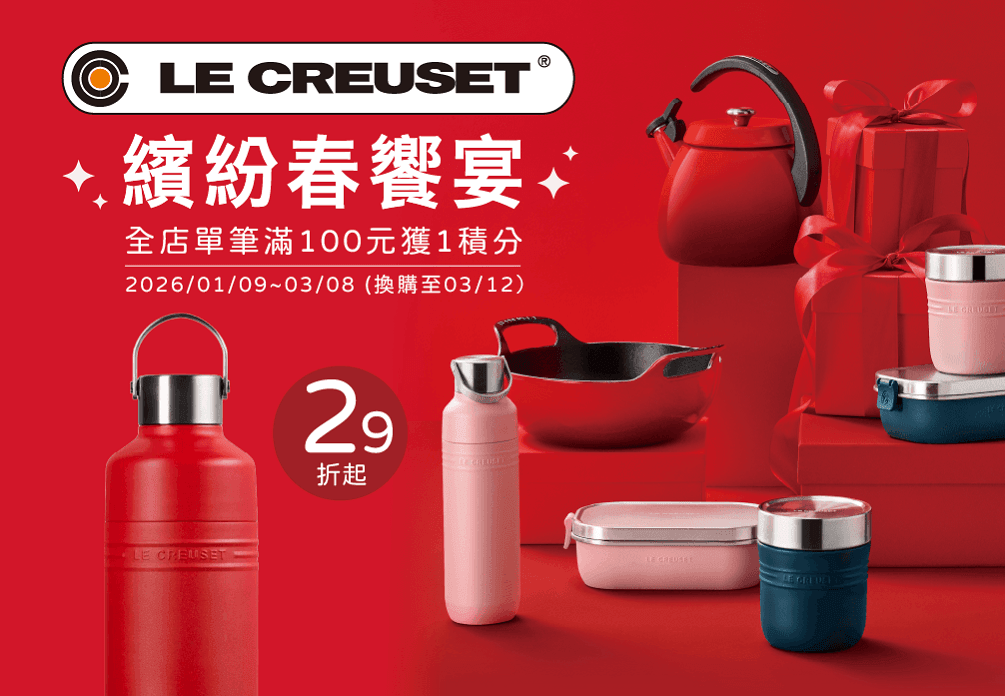 換購機制:福利卡友單筆消費每滿100元獲1全店積分,2全店積分起或300福利點即可加價換購【LE CREUSET】繽紛春饗宴主題商品乙款。