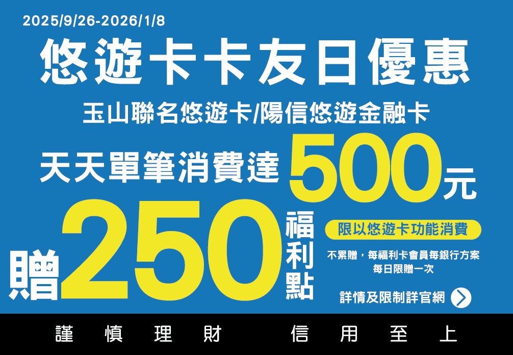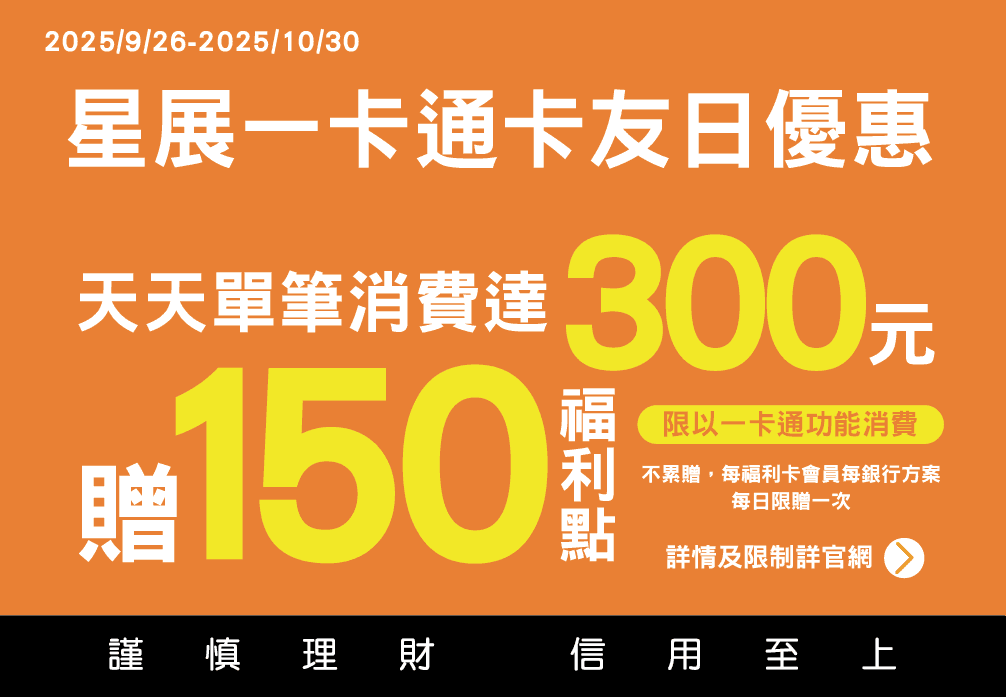 天天使用星展銀行一卡通聯名卡,以一卡通票證功能扣款單筆消費滿300元贈150福利點(每福利卡會員每銀行方案每日限贈一次)。