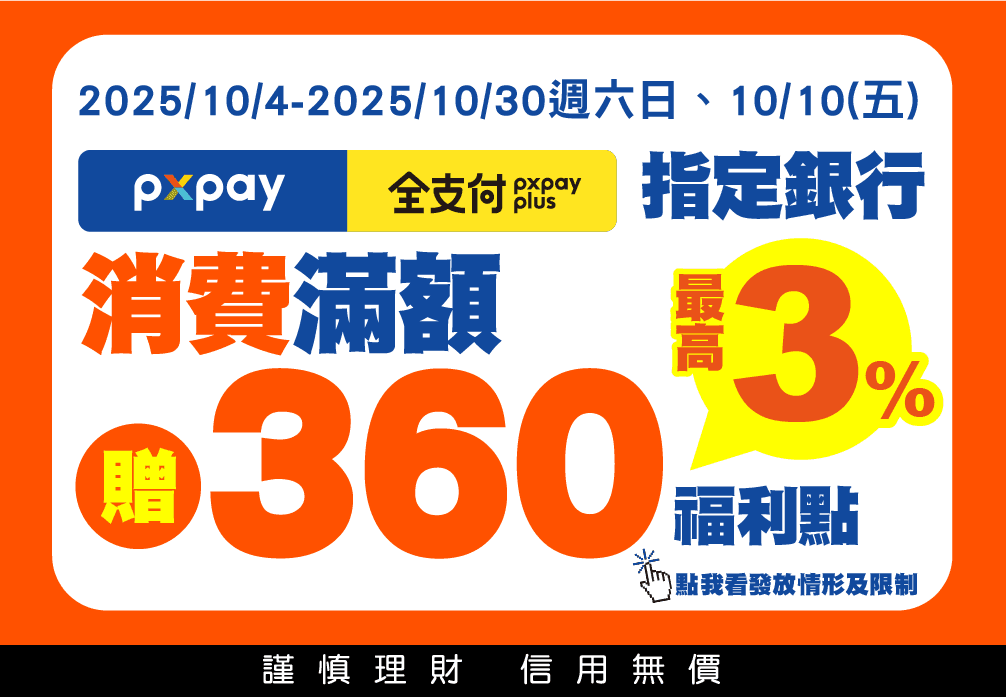 4.本活動之單筆消費金額不包含購買菸品、一歲以下嬰兒奶粉、福利卡/電子票證儲值、PX GO!之PX Pay支付、小時達及紅包儲值功能、代收/售、購買禮券、福利點兌換或加購商品、官網/賣場/APP/DM標示或公告之指定排除商品等交易金額。