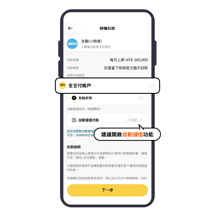 授權扣款設定扣款方式:若選擇「全支付帳戶」,建議開啟自動儲值功能