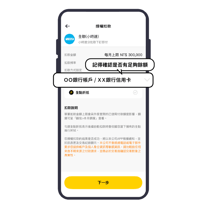 授權扣款設定扣款方式:若選擇「銀行帳戶/信用卡」,記得確認是否有足夠餘額/額度