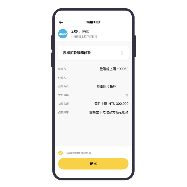 確認授權扣款資訊,同意條款內容