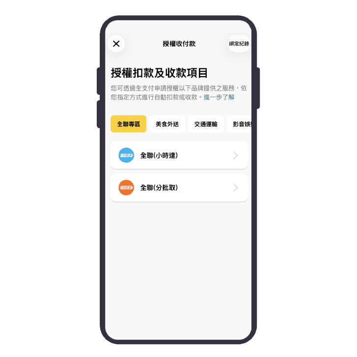 至「全支付>授權收付款」,即可查看授權收付款資訊