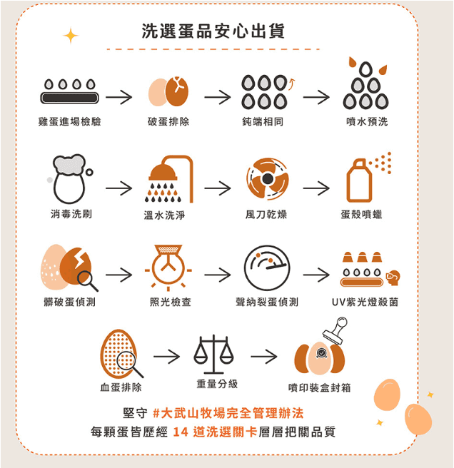 每顆蛋皆歷經14道洗選流程層層把關品質,確保消費者享受到高品質的洗選雞蛋。