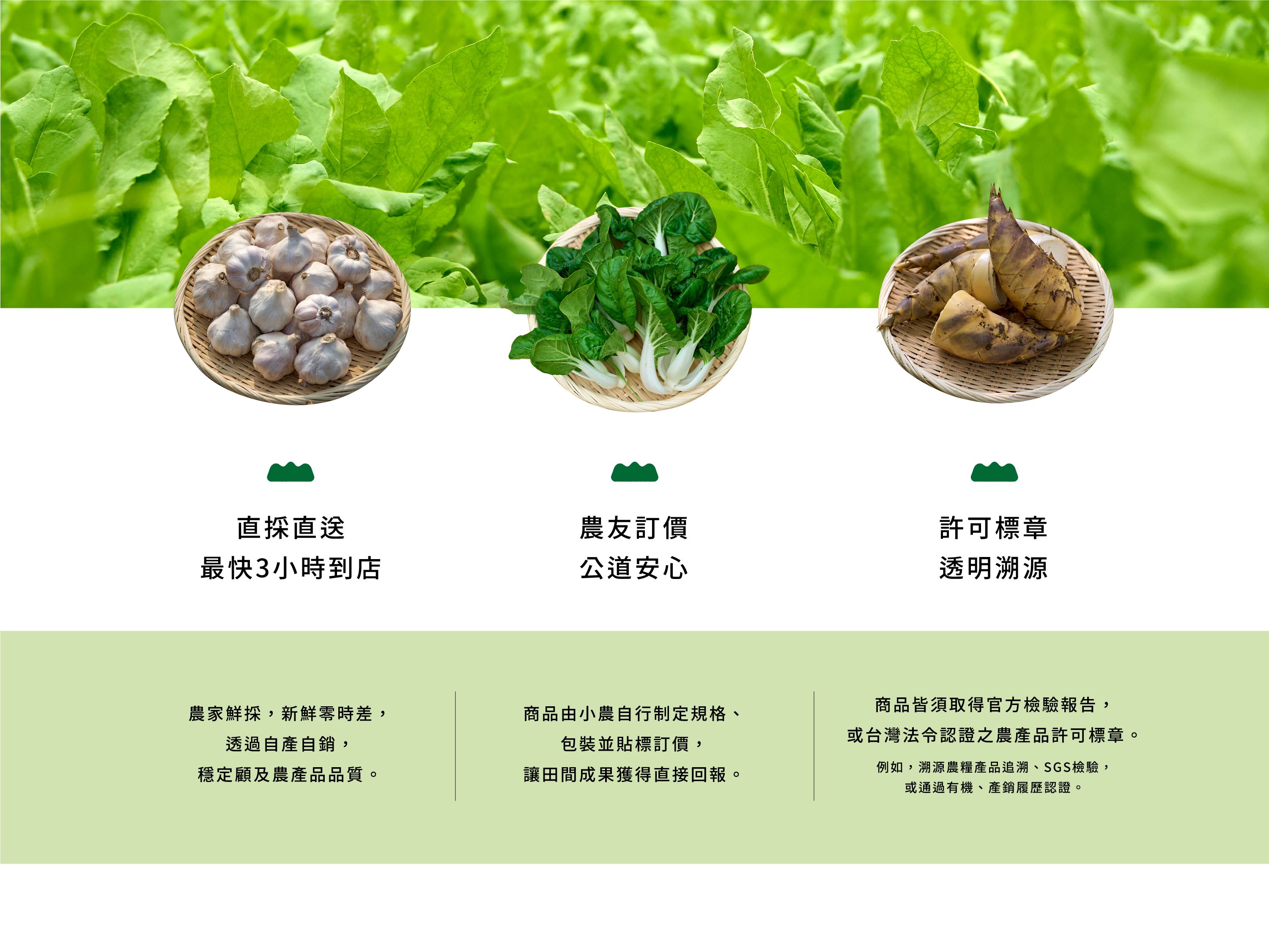 小農直採專區所販售的商品全由農友自行包裝、訂價與運送而來,我們要讓小農和消費者的距離能更緊密的結合,讓新鮮零時差的傳送,讓小農在田裡的成果能獲得最直接與公平的回報。小農直採的農產品有著小農對農作物種植的用心、對土地與健康的堅持,有著農友最嚴謹的品質管理與最安心的生產保證。