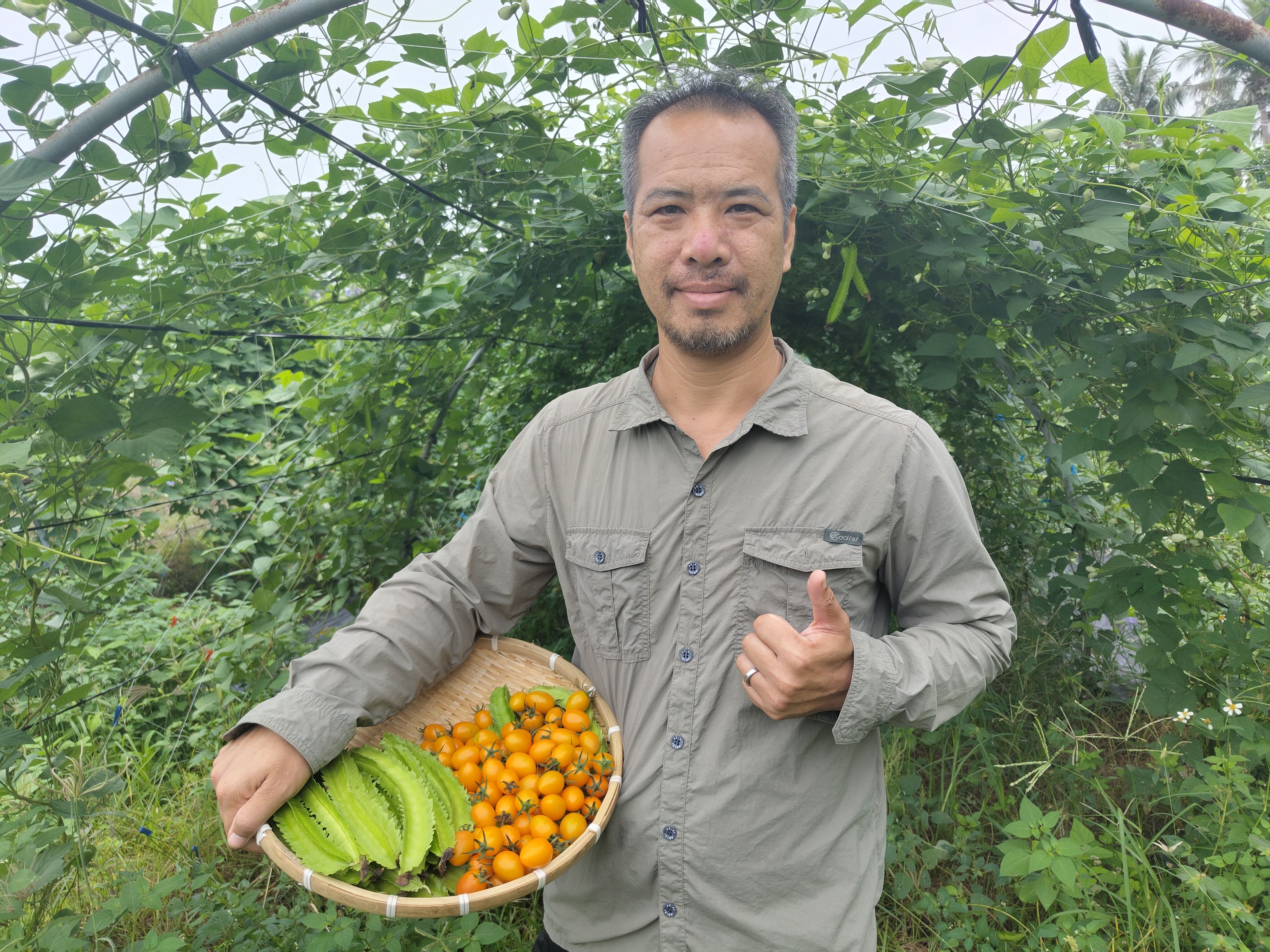 在海外農技團交流工作,曾在國外推廣農業技術多年,因為喜愛香草植物,二 一三年回台之後選擇在花蓮吉安鄉,採有機耕作法種植最喜歡的香草作物,並透過全聯農家直採門市,推廣新鮮香草的應用。