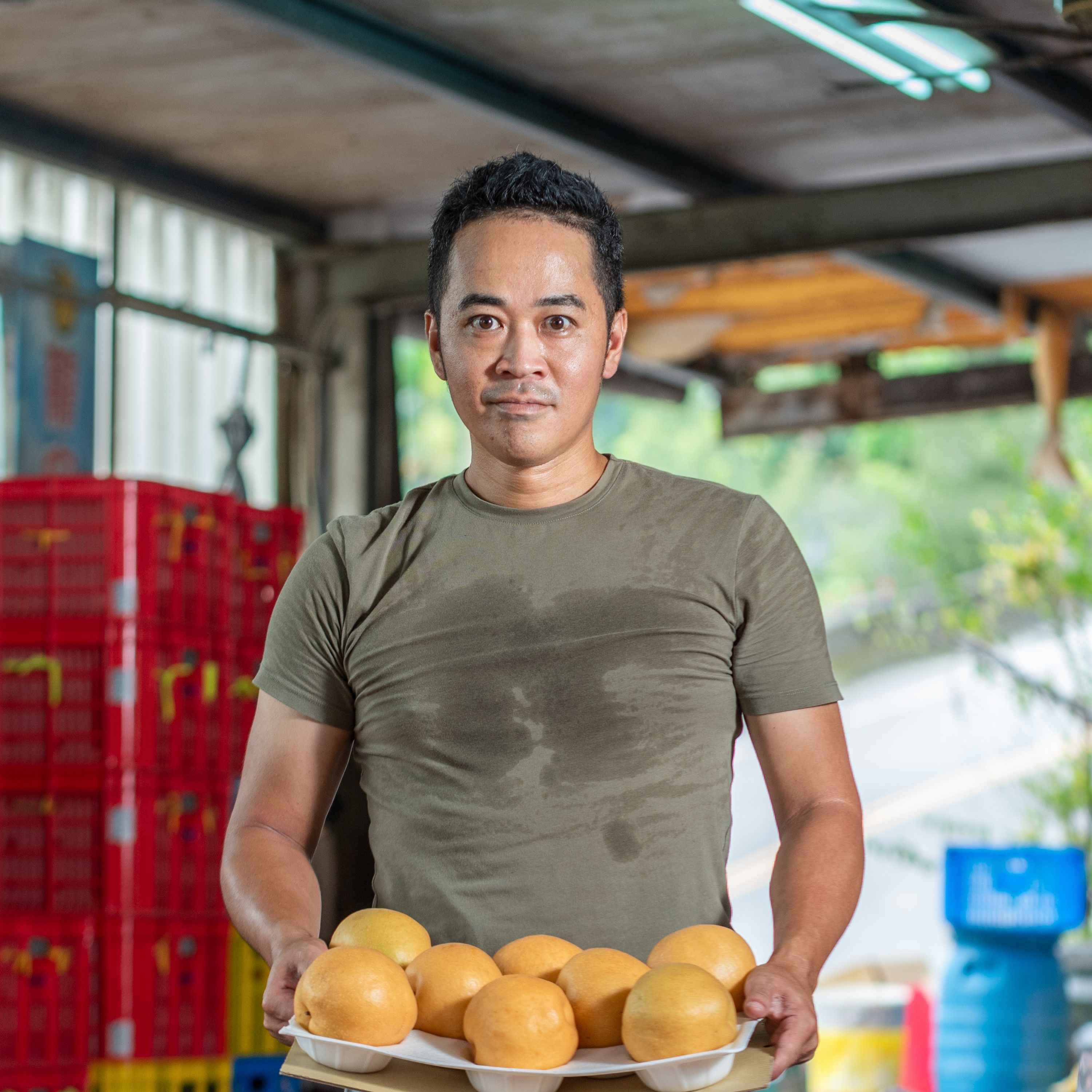 龍安果園第一代堅守新社山區辛勤種果逾三十年,2016年第二代青農劉豐嘉加入全聯農家直採門市,以皮薄汁多、口感爽脆且不用生長激素的新興梨,讓消費者能品嚐到更安全、甜度更高的夢幻逸品。
