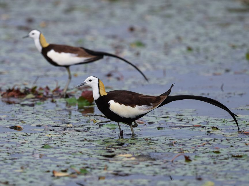 到農友林丙火夫婦所種植的菱角田,運氣好的話,可以看到成群的水雉像凌波仙子般在菱角田上輕盈跳舞。水雉,是一種有著美麗長尾羽、外型有如雉雞般的水鳥,經常棲息在環境不受污染的菱角田,並在此築巢下蛋、孵育下一代,也被稱為「菱角鳥」。然而多年前,水雉鳥卻面臨菱角減產、菱角田逐年萎縮,濕地棲地消失和減少、族群被毒殺、因鳥網纏繞而死亡等生存困境!