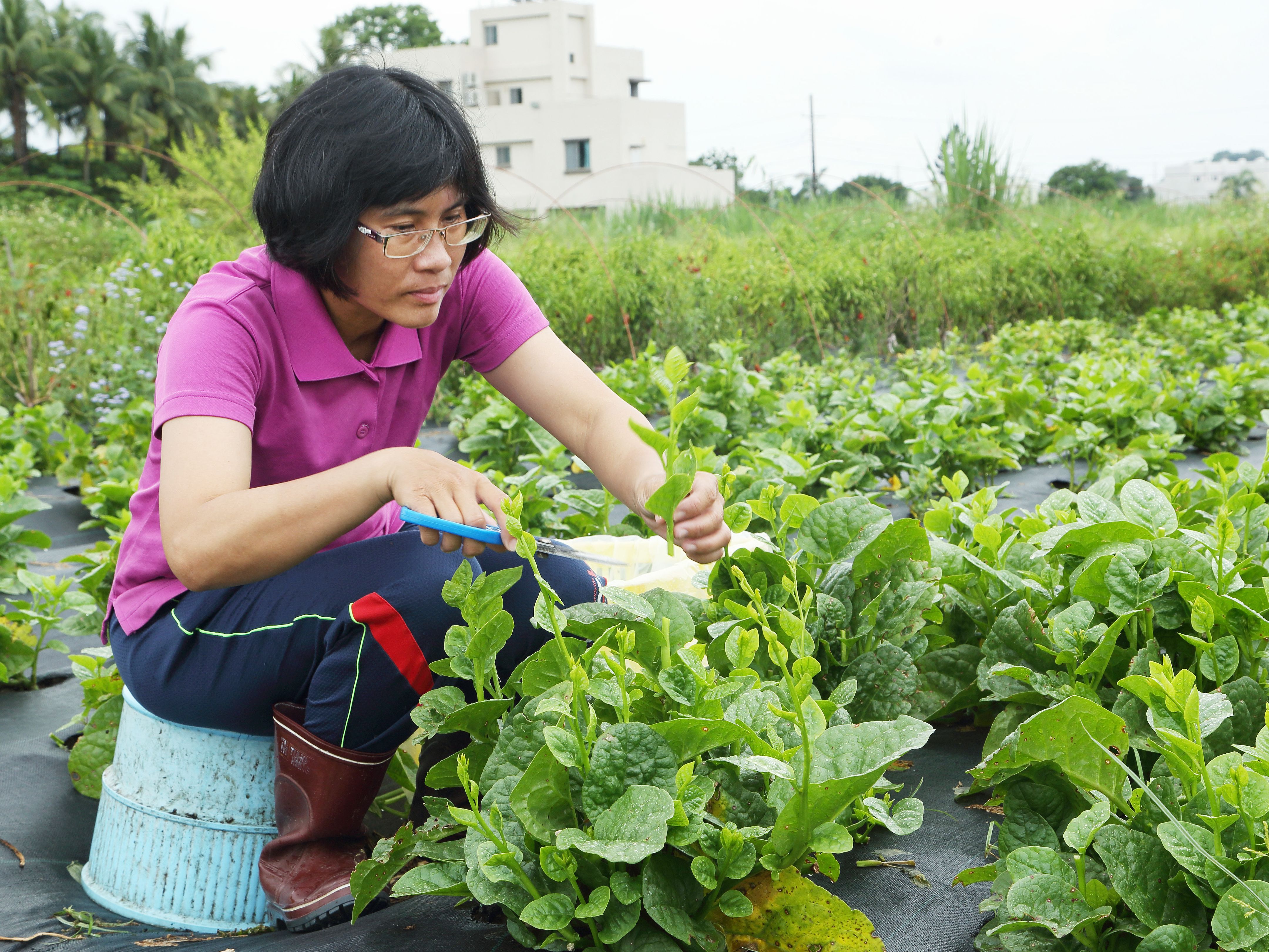 熟知田間栽種與作物特性的吳立芩說,九層塔是台式料理中重要的調味配菜,為了讓香氣維持濃郁、口感佳,採收時只取最嫩的那株葉片,常有客人說我們的九層塔特別香,一打開袋子遠遠就能聞到濃濃香氣;為了要讓客人吃出最佳口感的有機皇宮菜,採收時僅取最嫩的那節菜葉,且一邊採收一邊整理,消費者買回家幾乎不用再挑,就能立刻清洗烹煮。