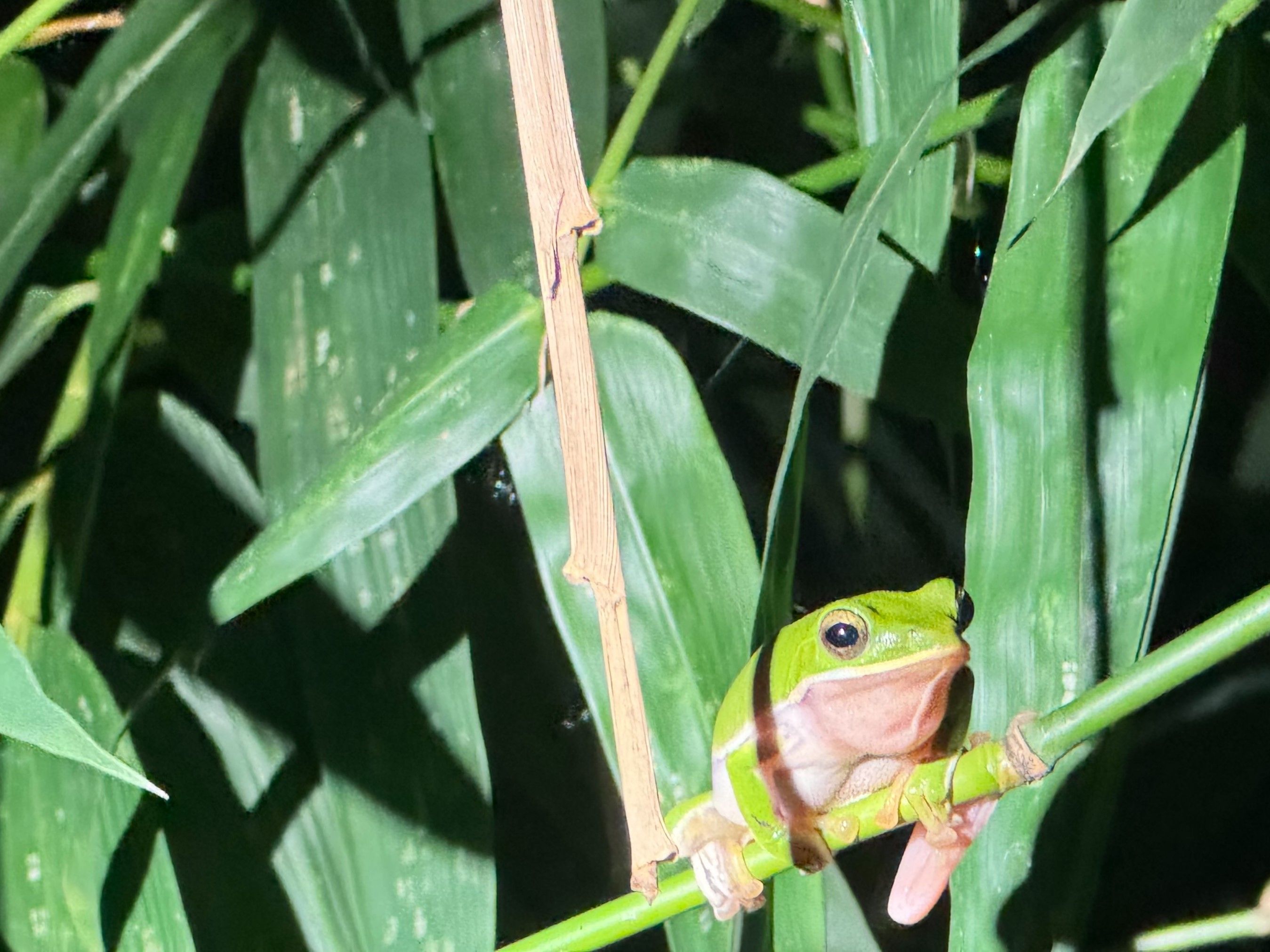 諸羅樹蛙是臺灣雲嘉南的特有蛙類,綠背肚白、叫聲宏亮,小時候,大家都稱牠們為「雨怪」,因為一下雨就出現一堆,之後,大批農民砍掉竹林改種鳳梨,導致諸羅樹蛙數量銳減。農場成立後,南華大學老師找上汶勳,希望他能夠參與諸羅樹蛙復育計畫,他不僅爽快配合,還號召從事友善栽種的農友加入。 他指出,我們就在農場內,留幾處20公分深的水漥,供樹蛙產卵,夏天雨水足,不需要費心,冬天雨水少,灌溉竹筍時,順便將水漥注滿水即可。小時候,曾認為蛙叫聲好吵,現在蛙叫聲媲美交響樂。