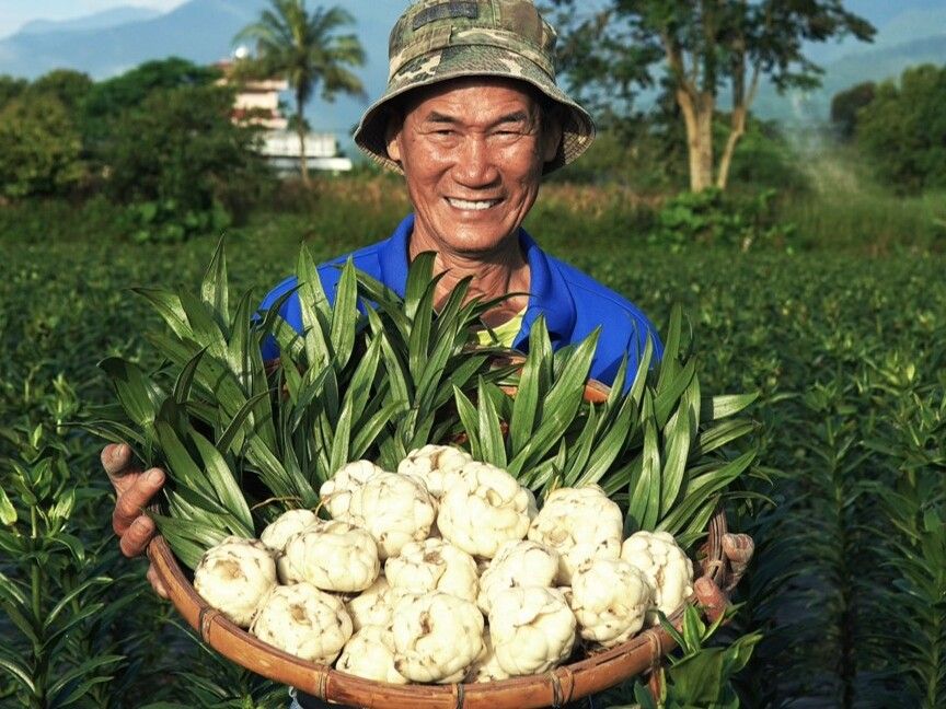 百合有「百年好合」之意,可食用的部位是地下麟莖,富含澱粉、蛋白質、脂肪等物質,營養價值極高。從中醫角度來看,清潤甘甜、藥食同源的百合,是緩解體燥的優質食材,也是頂級健康食材,常見於養生餐飲菜單。新鮮的百合採收後需經過50天低溫冷藏熟成,讓鱗莖的澱粉轉化為醣類才會分裝上市。