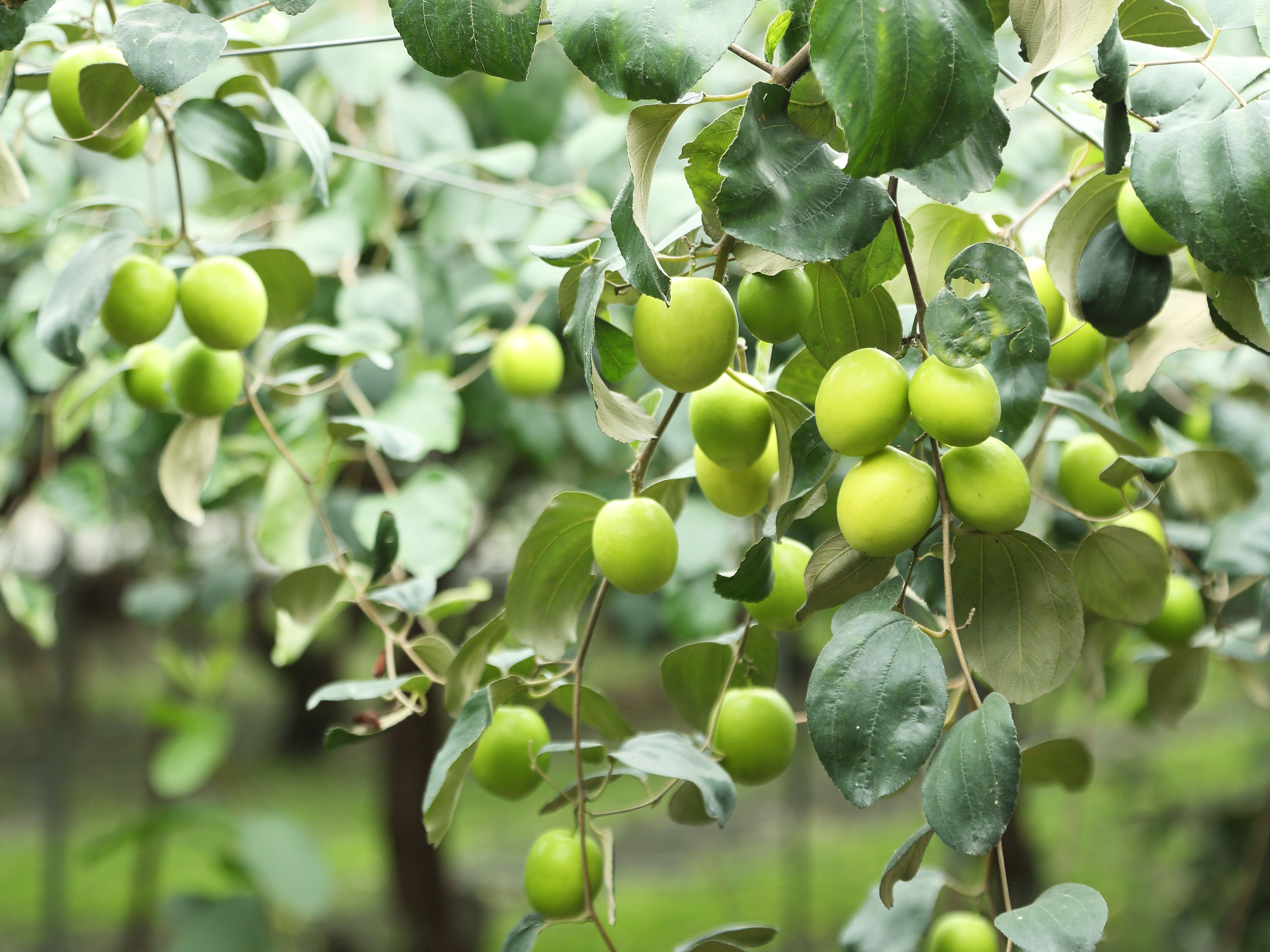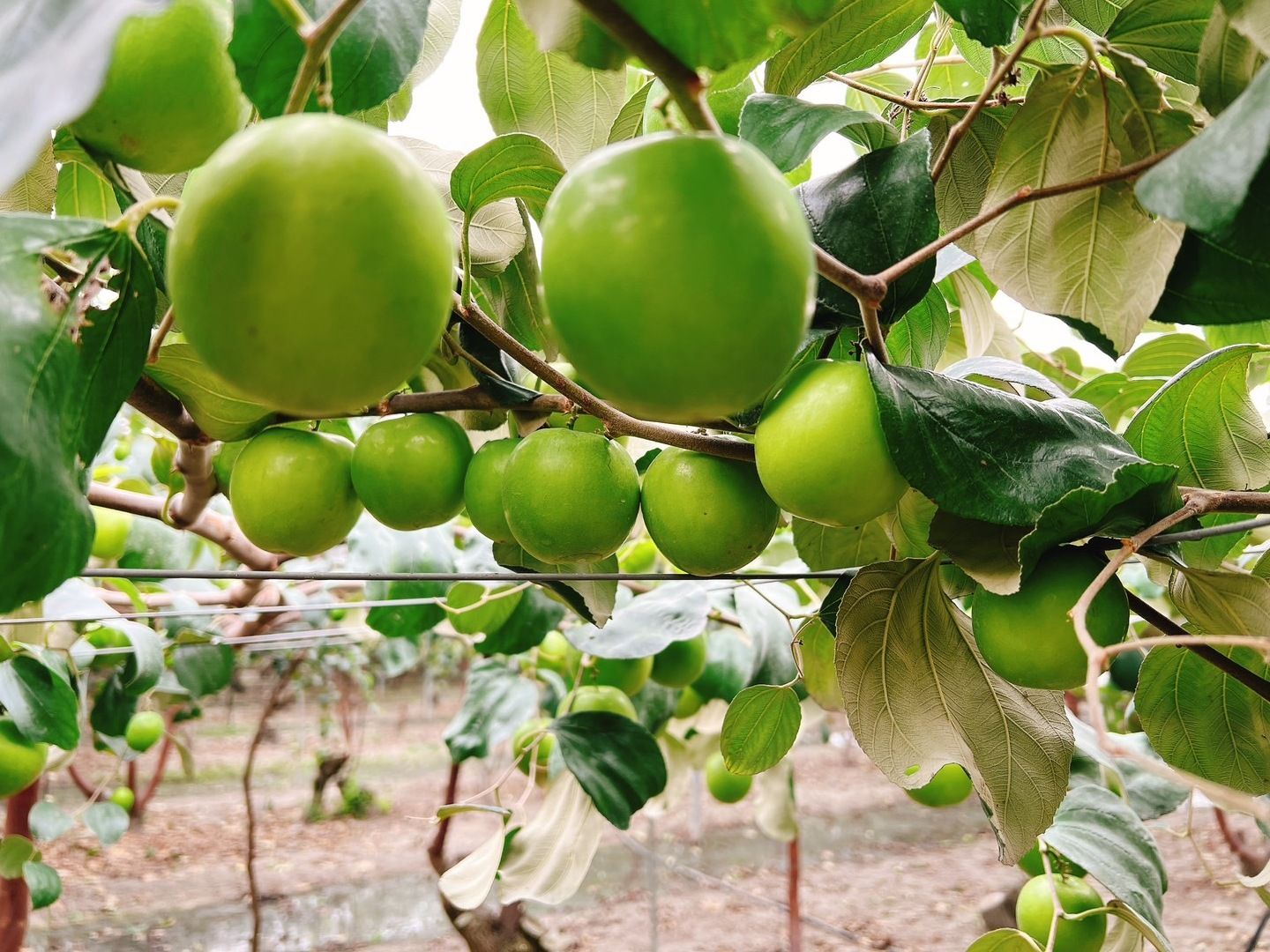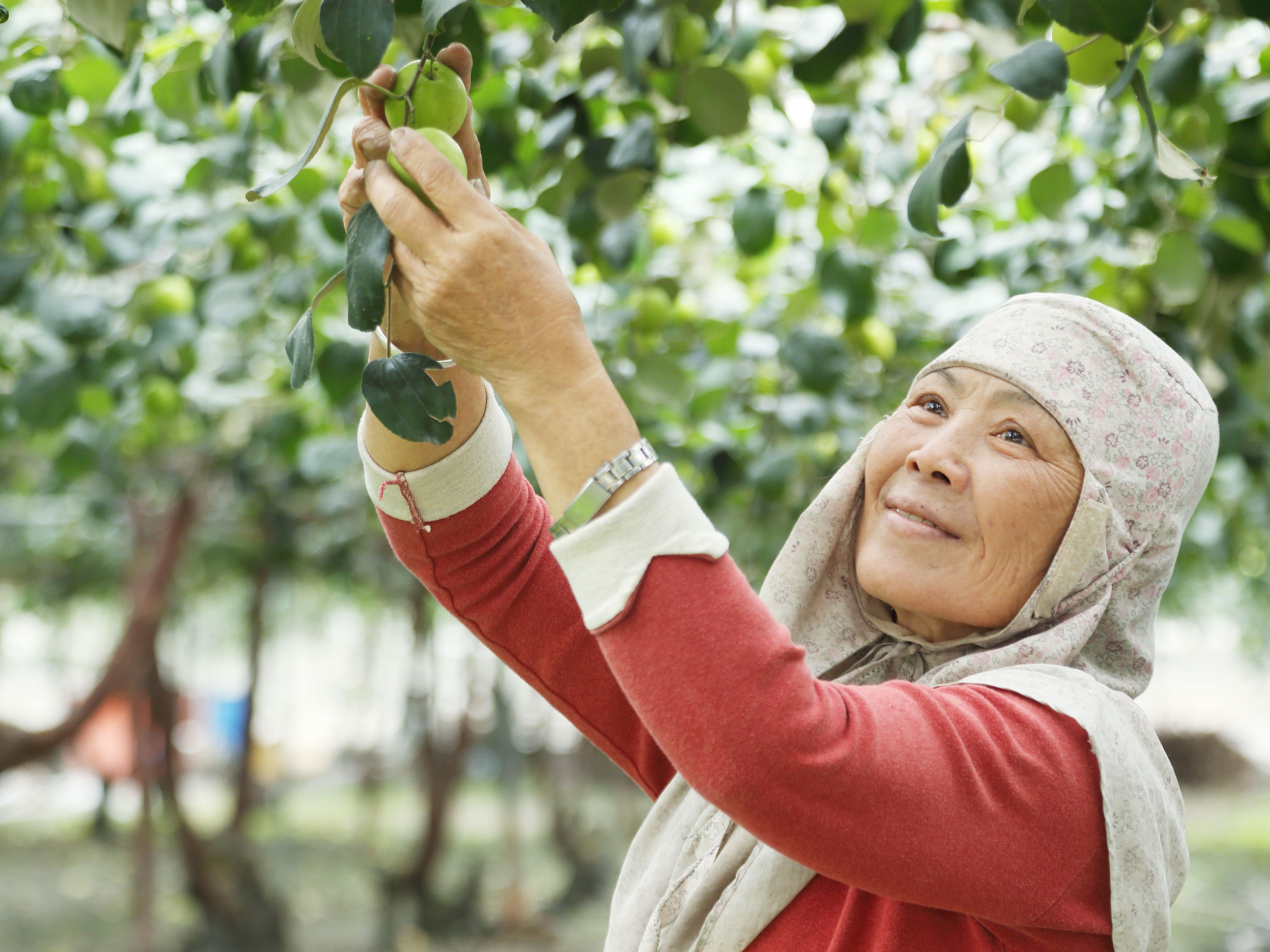 這些棗樹在每年約二月收成販售完畢後,會在三月底到清明節左右將果樹砍半,截下來的枝幹用機器打碎作為肥料,再混入土裡鋪平;如果有哪一棵樹的水果品質沒那麼好,也會趁著這個時候嫁接上新的苗,調整果樹的體質。七、八月時,棗樹會漸漸開花結果,由於一次會結成許多果子,營養容易分配不均,疏果時就要先採掉一些果子,也可以藉此調整果實分布的位置,讓養分能夠被完整吸收,果子的個頭就能長得更大。