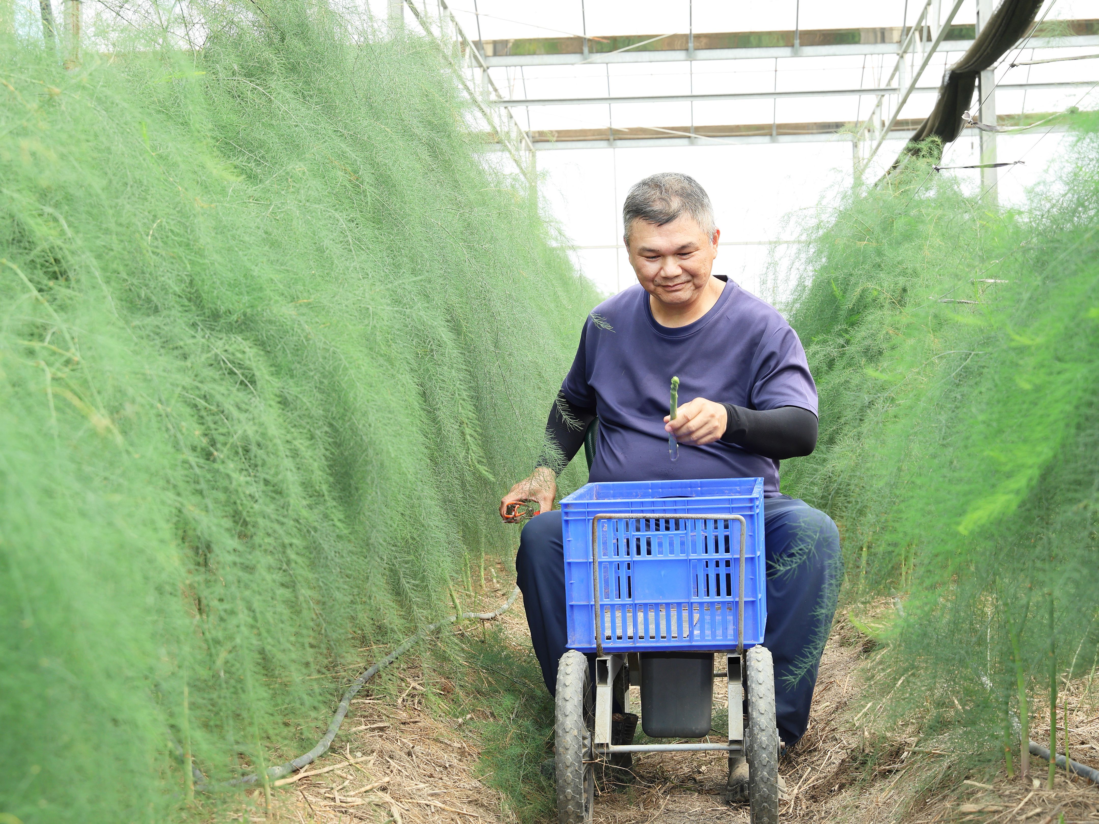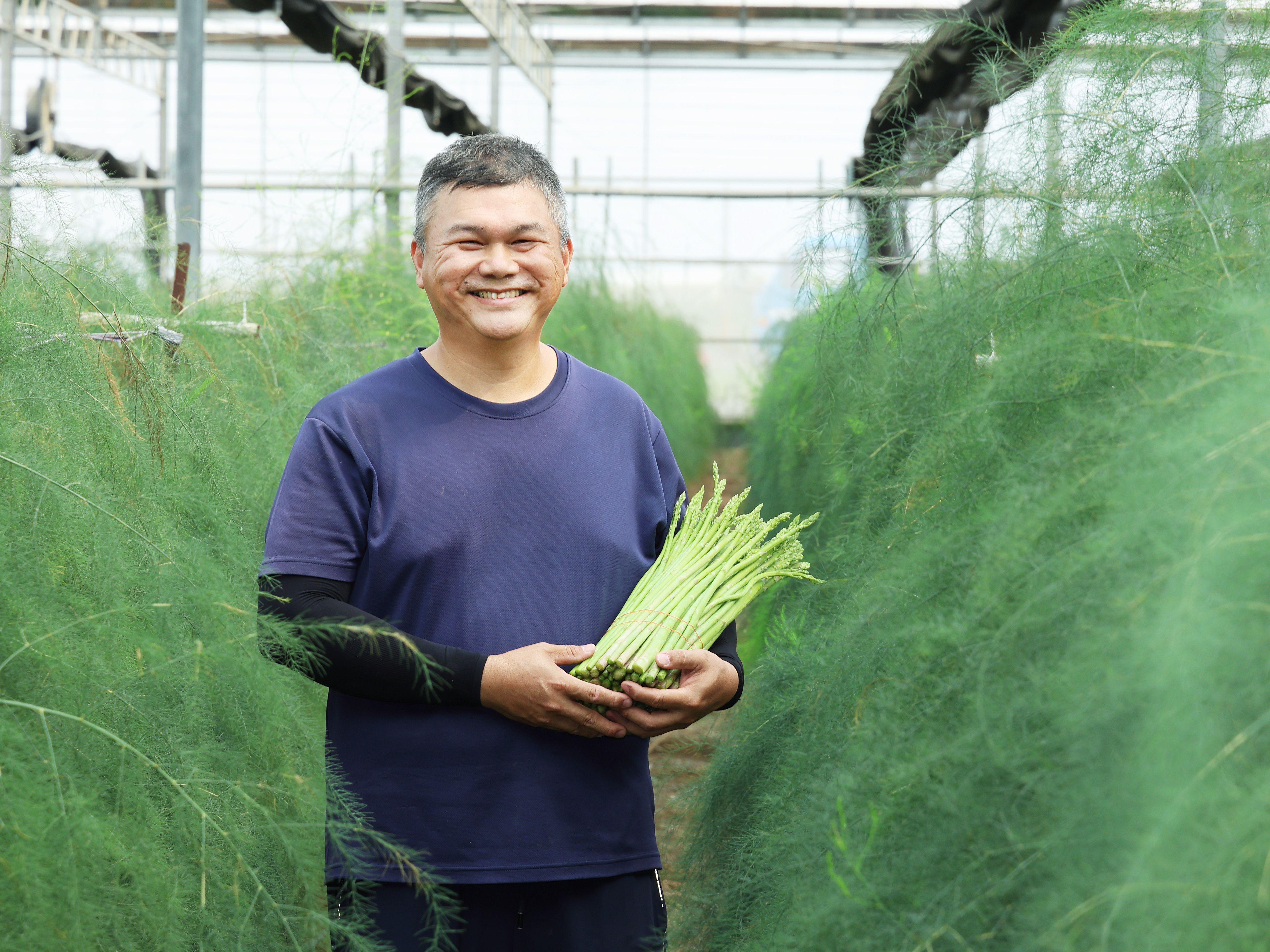 小農黃志偉原先在台北擔任多年的機械工程師,後來帶著家人一起回到老家雲林東勢,由於父母本來就是務農人士,黃志偉也有意轉向此路發展,經過多方摸索嘗試、與農業改良場合作,終於在綠蘆筍找到屬於自己的一片天地。 黃志偉坦言,台灣綠蘆筍的種植量還是不夠,進口量將近七成才能滿足國內需求,這是由於綠蘆筍的前置等待期太久,所以投入的人相對較少。想種植綠蘆筍,先要先育苗三個月,種下去大約半年才能採收,而且前兩年因為綠蘆筍的芽盤不夠茁壯,所以產量較低,等到第三年產量才會開始爆發。
