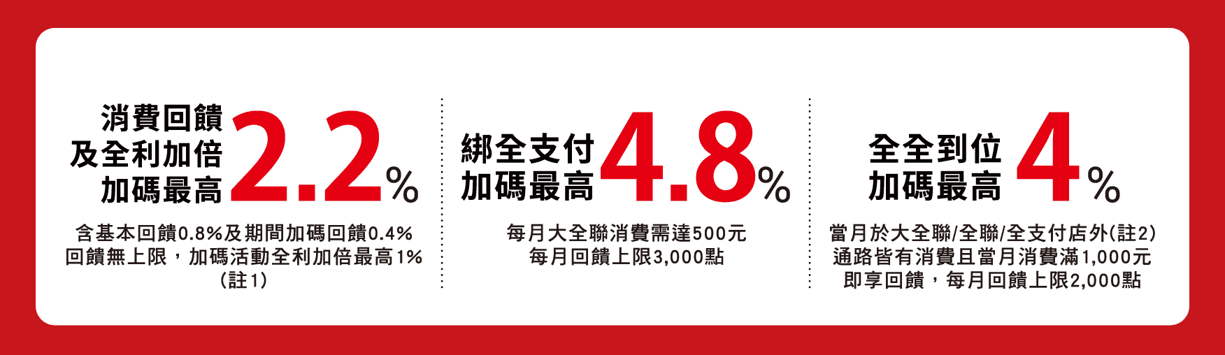 ▲全支付最高4.8%:綁定全支付消費在大全聯消費,當月累積滿500元享每消費100元48點。(每月回饋上限3000點)