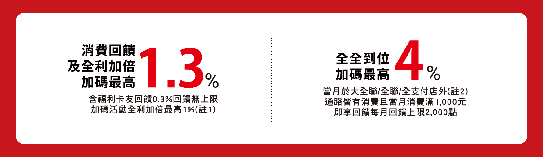 ▲全利加倍最高1% :每100元最高10福利點。(在大全聯或全聯消費,每月合併回饋上限2000點)