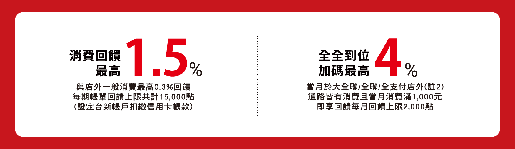 ※大全聯信用卡店內消費係指大全聯量販賣場內之大全聯信用卡實體卡與全支付綁定大全聯信用卡消費( 量販賣場外之美食街、餐廳、特約商店或專櫃、全聯福利中心,及行動支付如:台新 Pay等皆不適用回饋)。消費計算回饋不適用項目 :使用折價券/抵用券/福利點/全點折抵之消費金額,及購買菸品、一歲以下嬰幼兒奶粉、購買禮券及虛擬加值更多不適用指定商品依全聯福利中心官網公告為主。非自營專櫃及美食商店街除外)。