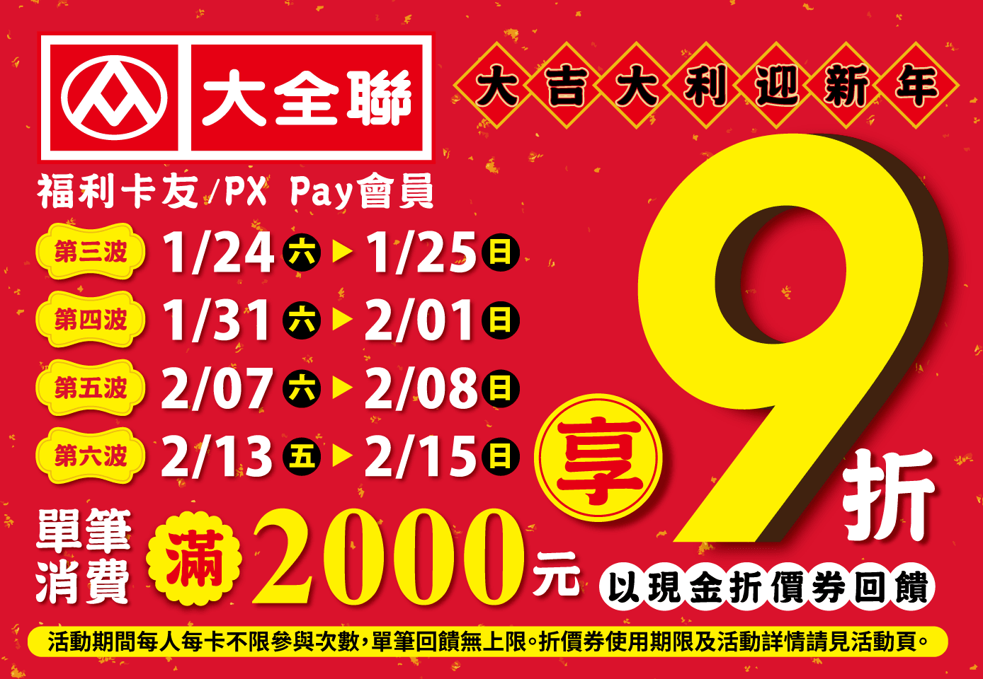 福利卡友/PX Pay會員 活動日單筆消費滿2000元享9折 (以現金折價券回饋)