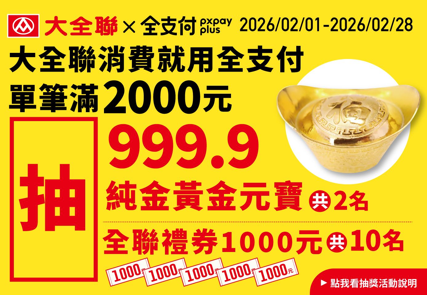 2.活動門檻金額計算「不含」 : 購物袋、報章雜誌、軍用品、印花/積分/福利點換購商品、儲值、購買(電子)禮券/樂透卡/提貨券、線上購物/外送/鮮食集/美食商店街等之交易、代收售/繳費、運送安裝/服務費、大宗交易、折價券/購物金/抵用券/振興券/福利點或全點折抵之金額,藥品、菸品、一歲以下嬰兒奶粉、大宗採購、安裝運費、門號預繳費用、虛擬儲值商品、汽機車工坊、黃金珠寶/宜得利/IKEA/無印良品/金石堂/大樹藥局/大樹寵物/寵物公園/阿中丸鋪/融燁食品/麥丘食品/La New/象鼻人/EDWIN/SOMETHING/5TH/泳裝/RQ-POLO/50%/阿瘦/米蘭/力力日/野獸國/LEE/艾薇莉特/貝妮嘉露/蕾黛絲/黛安芬/華歌爾/NEOFLAM鍋具快閃櫃以及其他專櫃販售商品、3C商品、HITACHI/CHIMEI/SONY/Apple/MITSUBISHI/SHARP/Panasonic/Dyson/ZOJIRUSHI象印/TIGER虎牌/大金等品牌家電等,活動詳情請洽現場服務人員或大全聯活動頁。