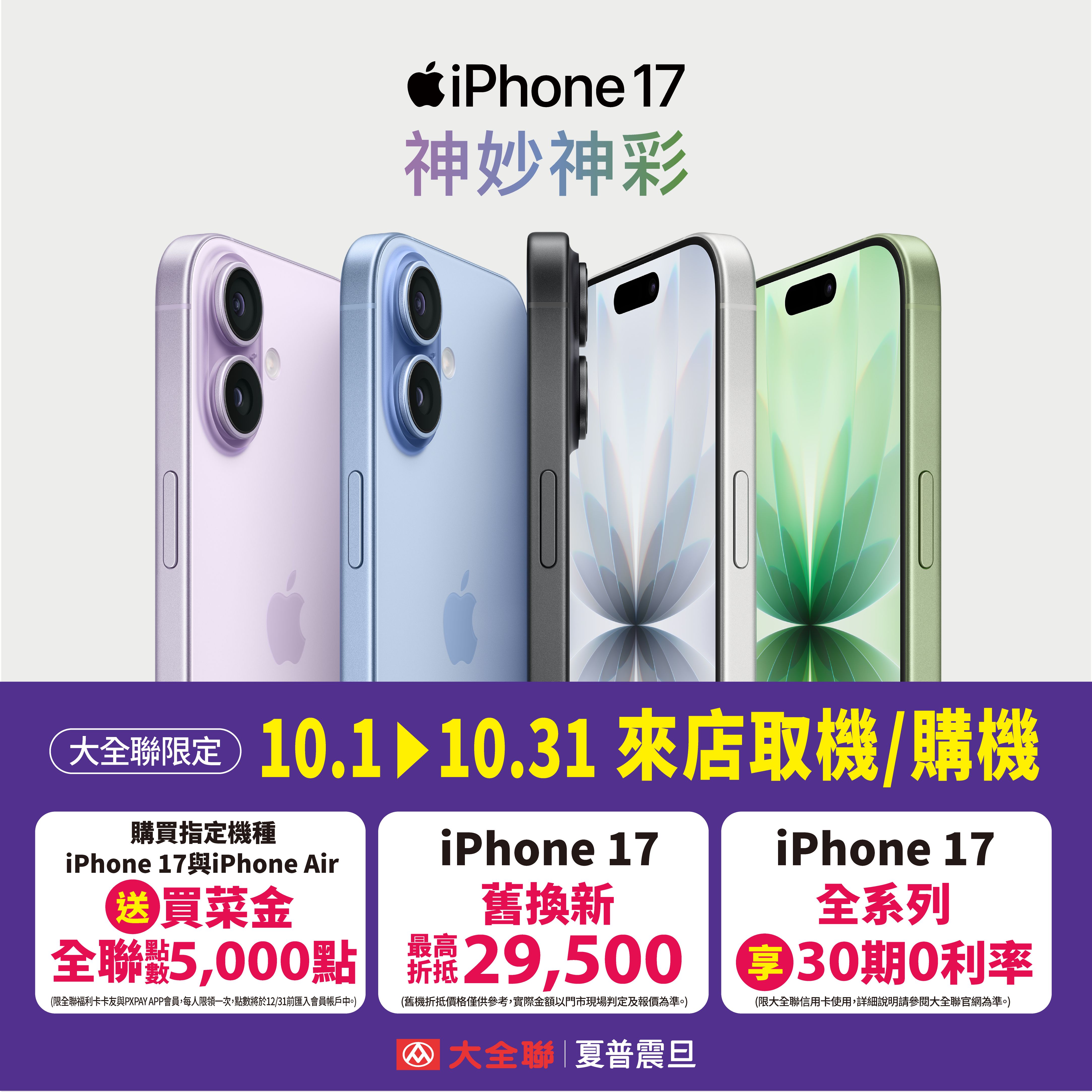 - 購買指定機種iPhone17及iPhone 17 Air 送全聯點數5,000點