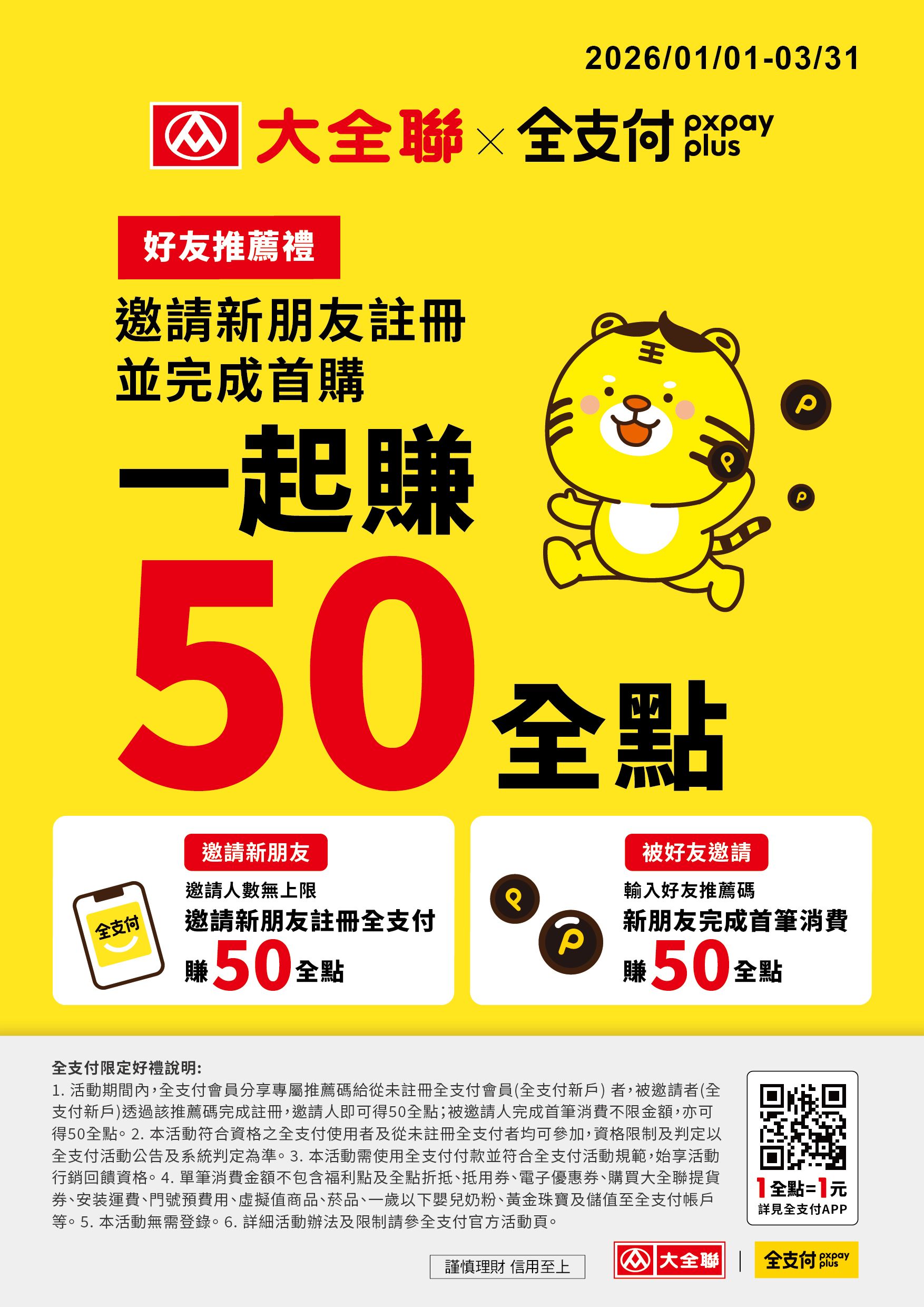 1. 活動期間內,全支付會員分享專屬推薦碼給從未註冊全支付會員(全支付新戶) 者,被邀請者(全支付新戶)透過該推薦碼完成註冊,邀請人即可得50全點;被邀請人完成首筆消費不限金額,亦可得50全點。