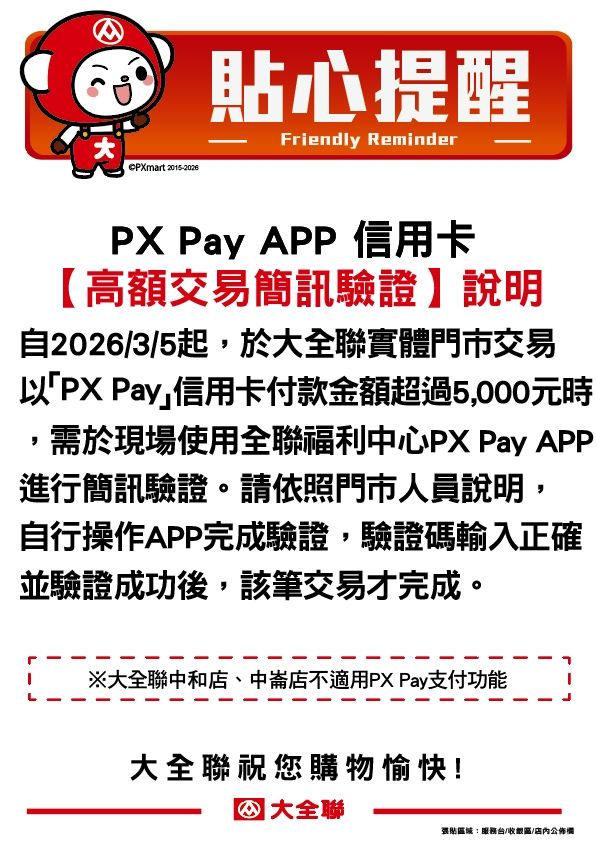 PX Pay APP信用卡高額交易簡訊驗證說明