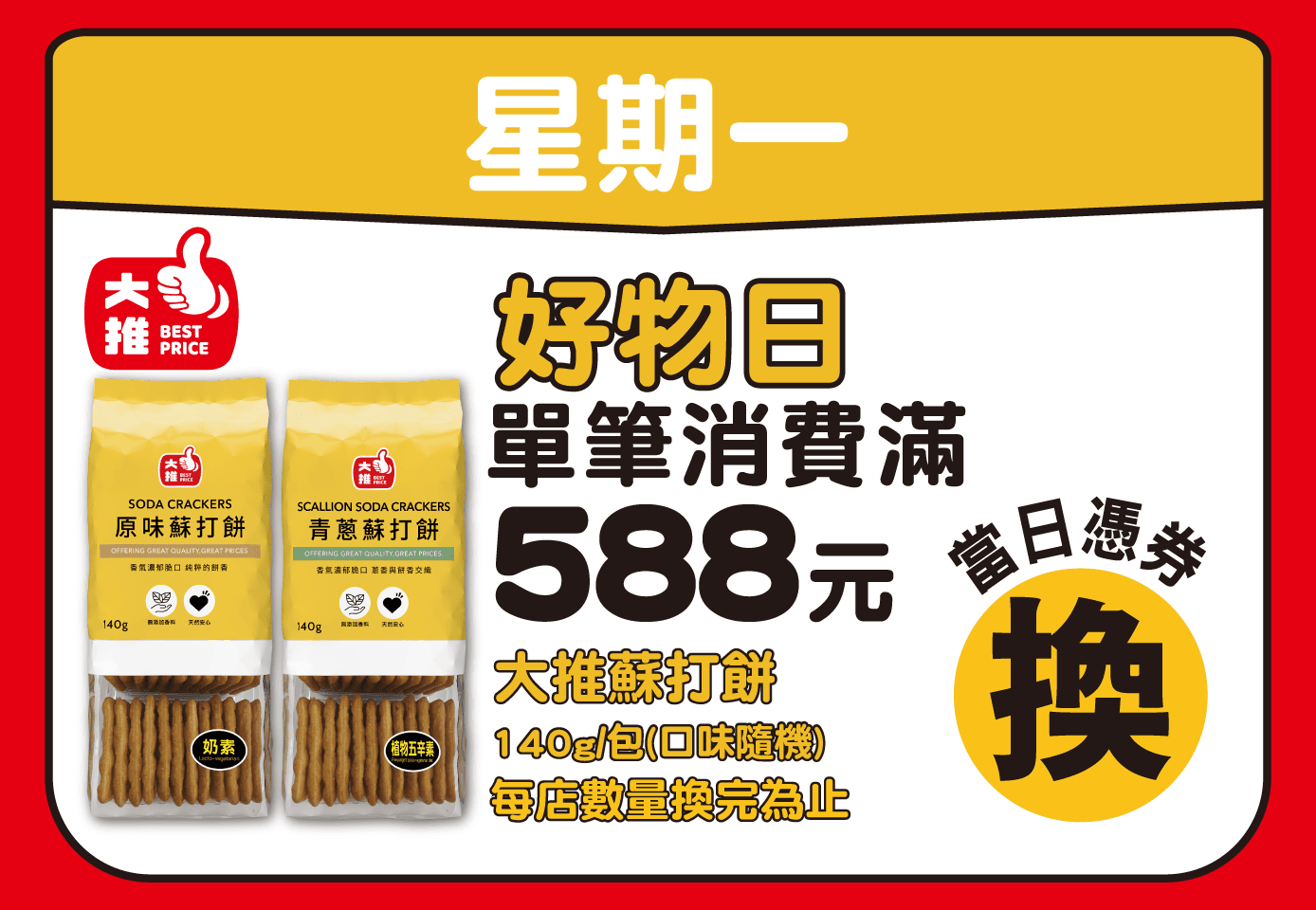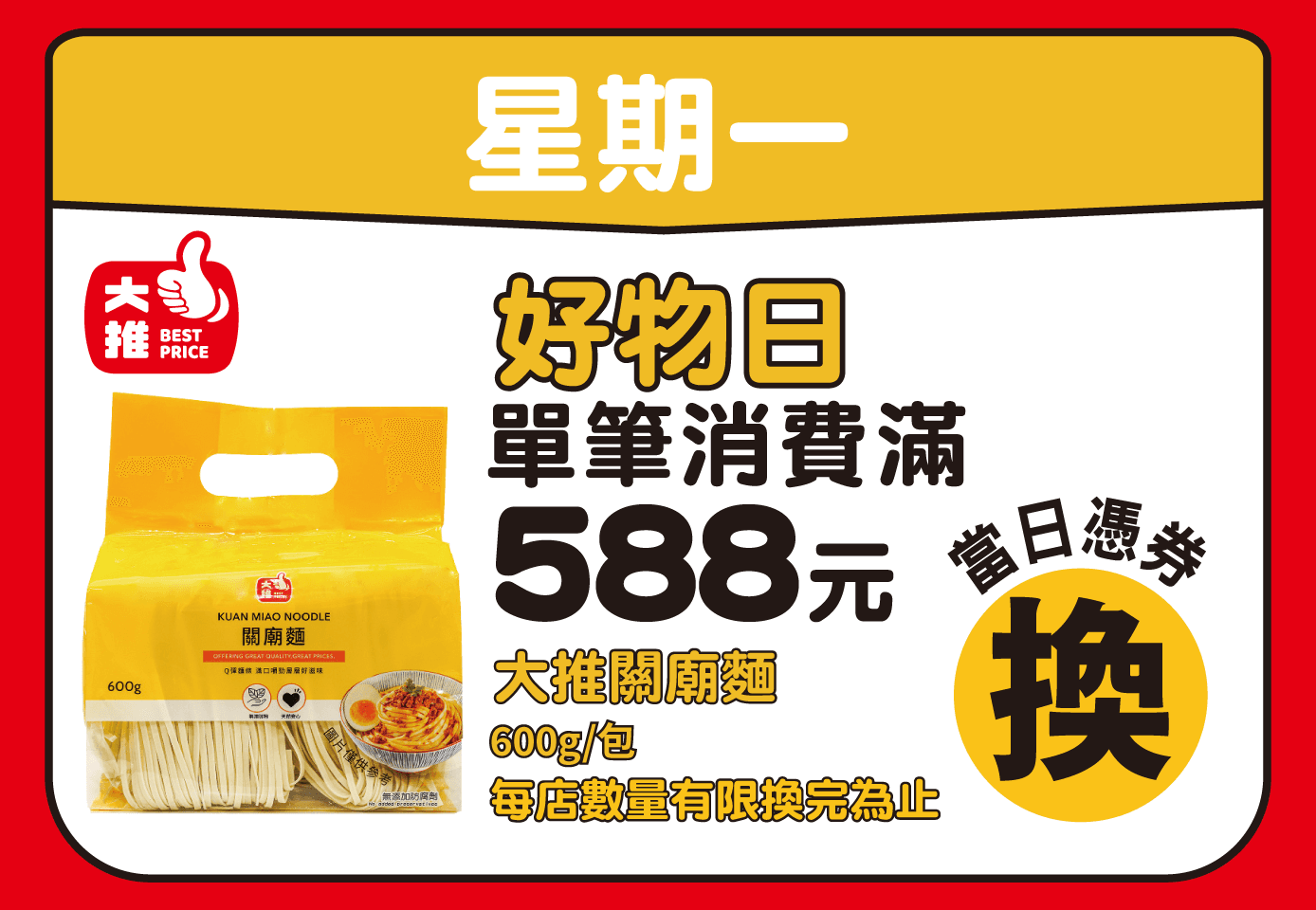 2.每人每卡當日單筆消費滿額限領乙次;每日每店限量,送完為止,抵用券適用店別及內容詳券面說明。全台每日限量:週一限1,800份、週二限3,500份、週三及週四單日各限1,600份、週五限1,000份、週六及週日單日各限1,500份。